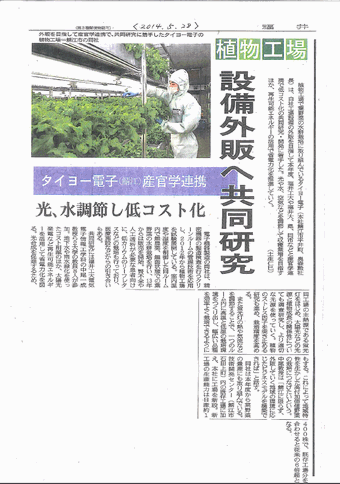 //2014/5/28 福井新聞 記事抜粋// 植物工場で葉野菜の水耕栽培に取り組んでいるタイヨー電子(本社鯖江市平井町、奥森勲社長)は、自社工場設備の外販を目指して本年度、福井工大や福井大、県、同市などと産官学連携で低コスト化の共同研究・開発に着手した。光や水、空気などを調節して収穫量増を目指すほか、再生可能エネルギーの活用で省電力化を推進していく。